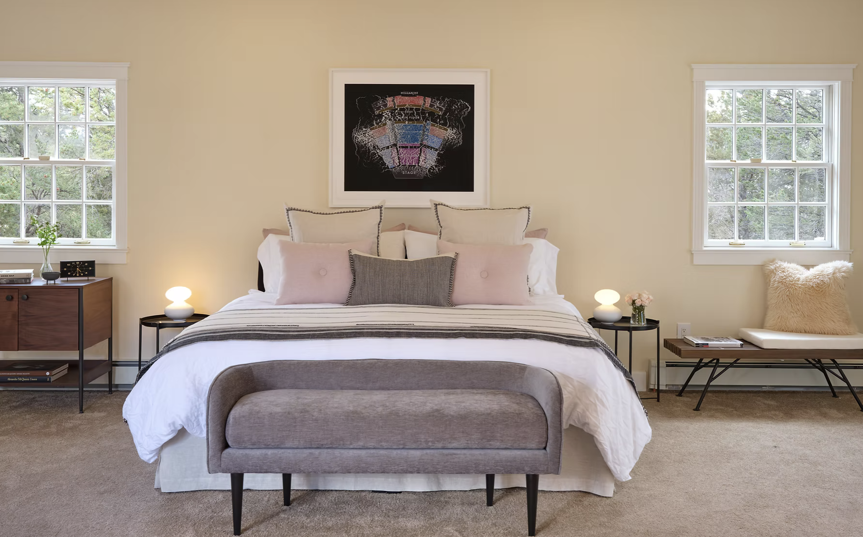 This elegant bedroom features 325 square feet of space, a large closet, a writing desk and a large ensuite bathroom.